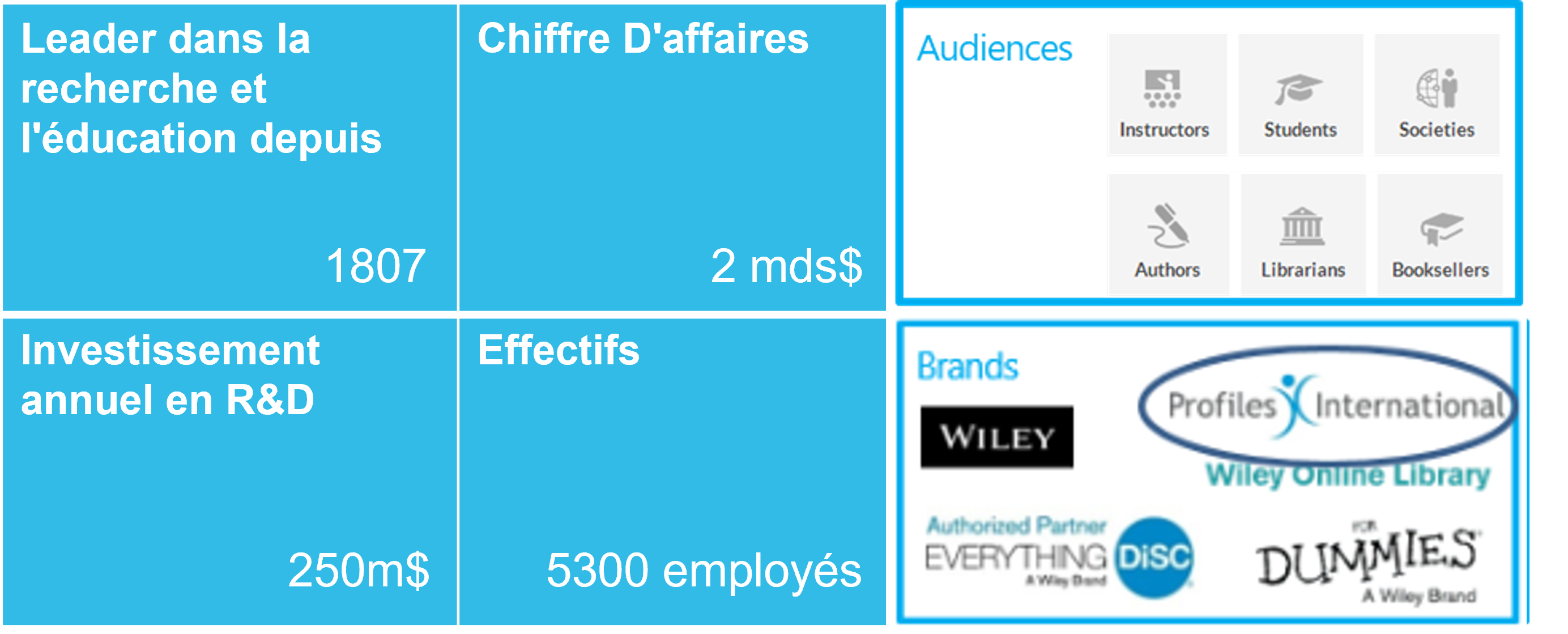Fournisseur mondial de connaissances et de services fondés sur la connaissance. Wiley améliore les résultats dans la recherche, l'éducation et le développement professionnel. Profiles International est l'une des marques du groupe Wiley.